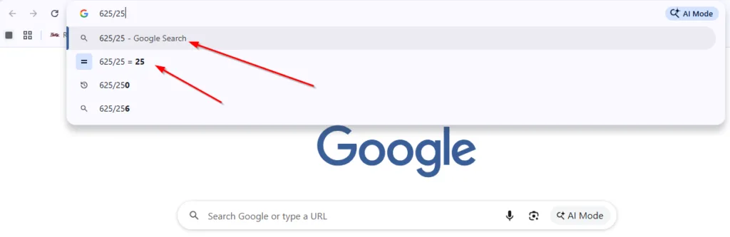 अगर आप address bar में 625/25 लिखेंगे, तो Chrome तुरंत answer दिखा देगा।